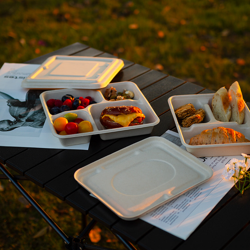 Sugarfiber 4-Compartment Lid Disposable Food Trays Compostable Disposable Food Container Bagasse Serving Trays Rectangle Made from Sugarcane Eco-Friendly Plant Fibers