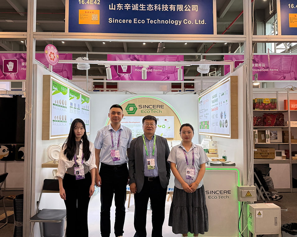 At this year’s Canton Fair, Sincere Eco Tech flagship product -fully biodegradable sugarcane pulp eco friendly tableware captured the attention of numerous domestic and international buyers. The product range, including sugarcane fiber plates, sugarcane bowls, bagasse food tray and bagasse clamshell packaging solutions, stood out for their sustainability and practicality. This eco-friendly tableware not only meets international environmental standards but also possesses excellent performance, effectively reducing plastic pollution. At the exhibition booth, buyers showed great interest in the product’s environmental features and market prospects, engaging in discussions and negotiations on-site.